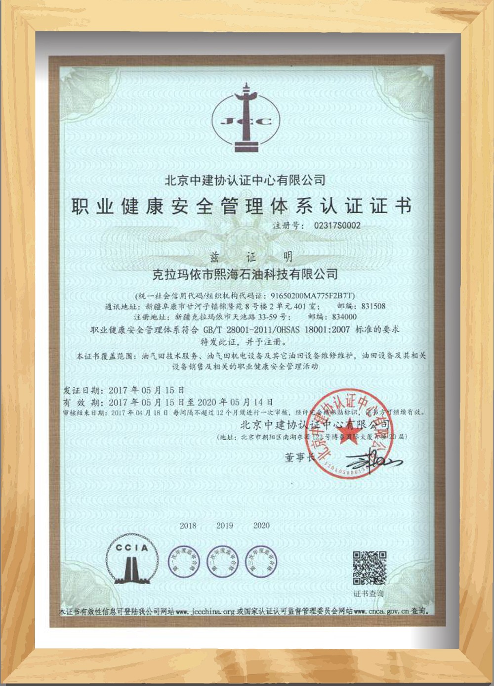 職業健康安全管理體系認證證書